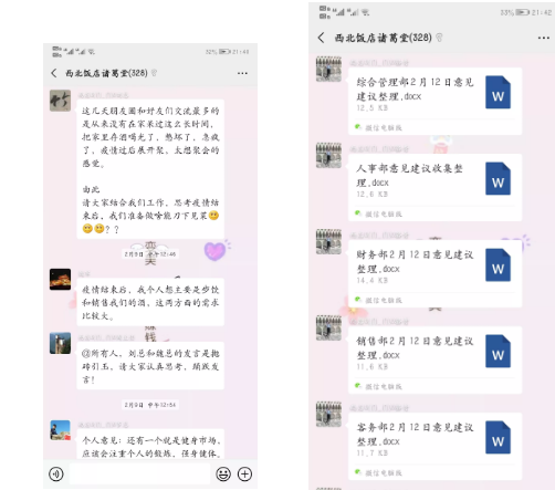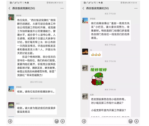 面對新型冠狀病毒肺炎的肆虐,為緩解員工壓力,消除對疫情的恐慌和不安,飯店黨委聯合工會,積極組建了“西北飯店黨旗紅”“西北飯店諸葛堂”微信群,鼓勵黨員干部、員工利用閑暇時間加強《學習強國》學習、讀一本好書、分享假期生活經驗、開動自己聰慧的頭腦為飯店發展建言獻策,當好一名參謀員,既有力加強了黨員的黨性修養學習,又調動了員工的積極性,促進了員工之間的溝通交流。目前,綜合管理部將各部門員工提出的好點子、好建議、好方法歸類整理,反饋給領導班子,為飯店2020年經營發展提供參考。